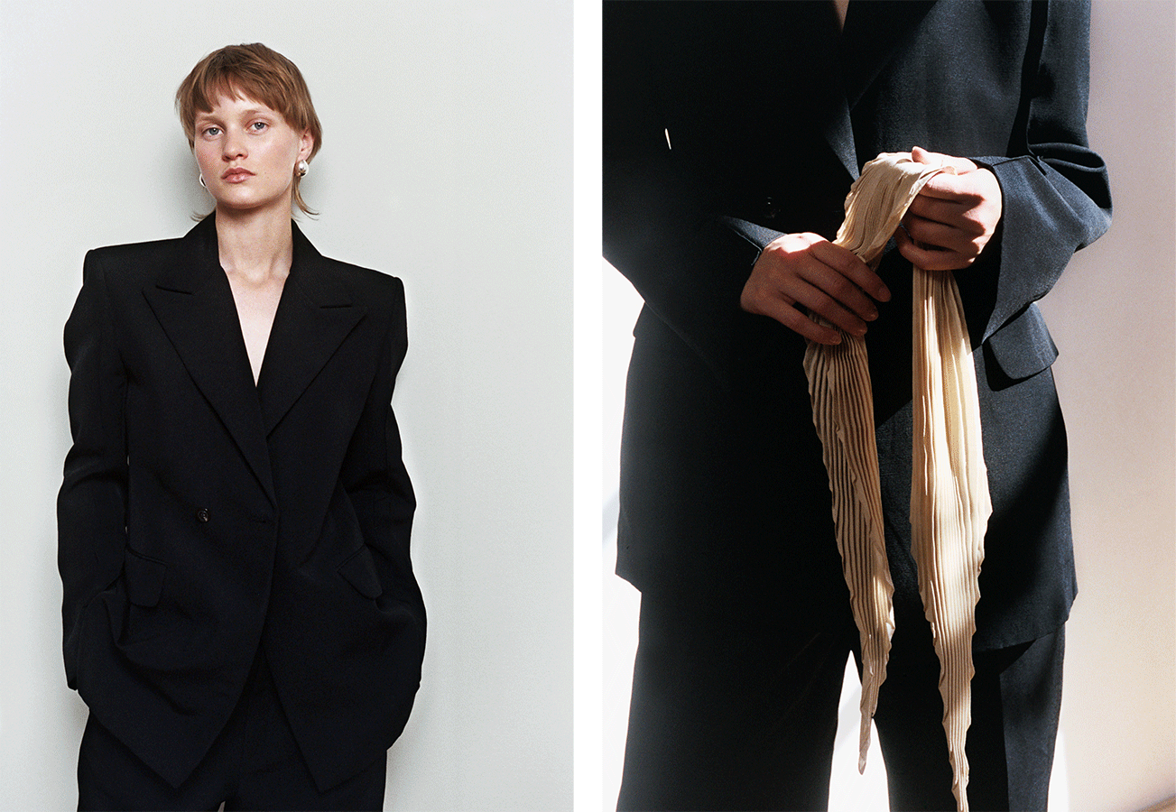 An oversized suit taken from the male wardrobe appears alongside a pared-down strapless wool dress. Shearling warms the body, while leathers glow in deep olive green or glossy black. Fine-gauge knits glide softly over the skin. Ivory Théa pumps, the Suzanna patent leather bag and a pleated silk scarf complete this sophisticated and understated look.