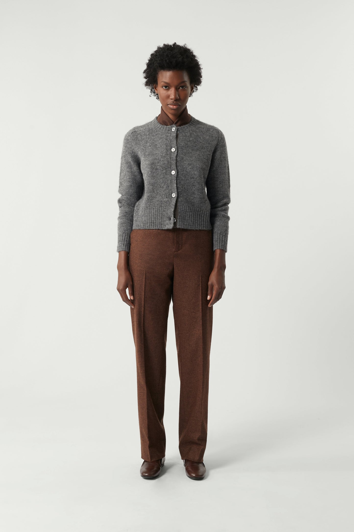Samuel est un pantalon droit emprunté au vestiaire masculin. Il possède une taille basse et est doublé jusqu’au genou pour le confort. Il peut être porté en ensemble avec le blouson Séoul pour créer le total look en flanelle chiné.